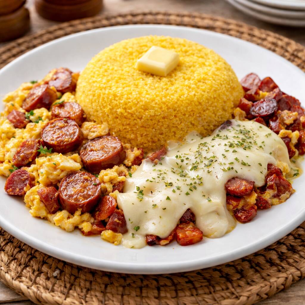 Cuscuz com Ovos Mexidos, Calabresa, Requeijão e Muçarela.