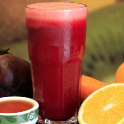 Suco de Laranja, Beterraba, Cenoura, Gengibre e Chia.