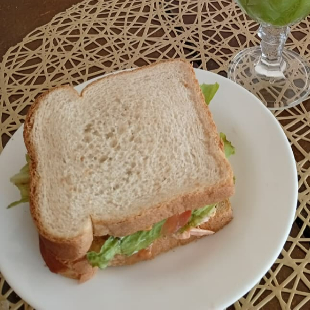 Pão integral, Frango com Cream Cheese, Cenoura, Milho, Ervilha, Cebola roxa, Alface e Tomate.