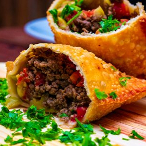 Clássico que nunca decepciona! Pastel recheado com carne moída bem temperada, suculenta e cheia de sabor, envolvida em uma massa crocante e sequinha.