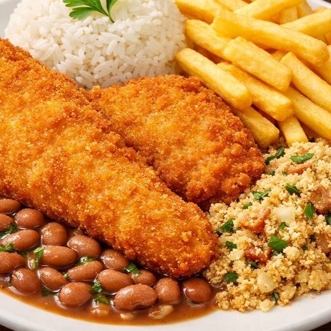 Frango a milanesa com fritas, arroz, feijão e farofa