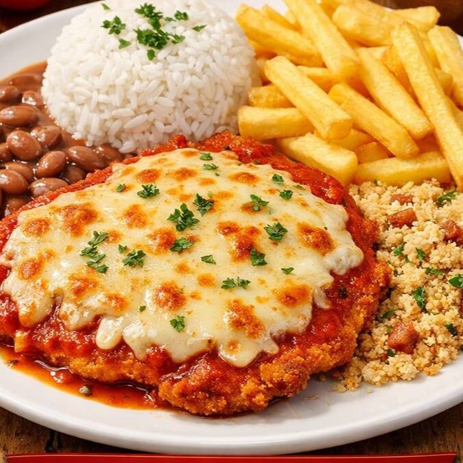 Frango a Parmegiana com Fritas, arroz, feijão e farofa.