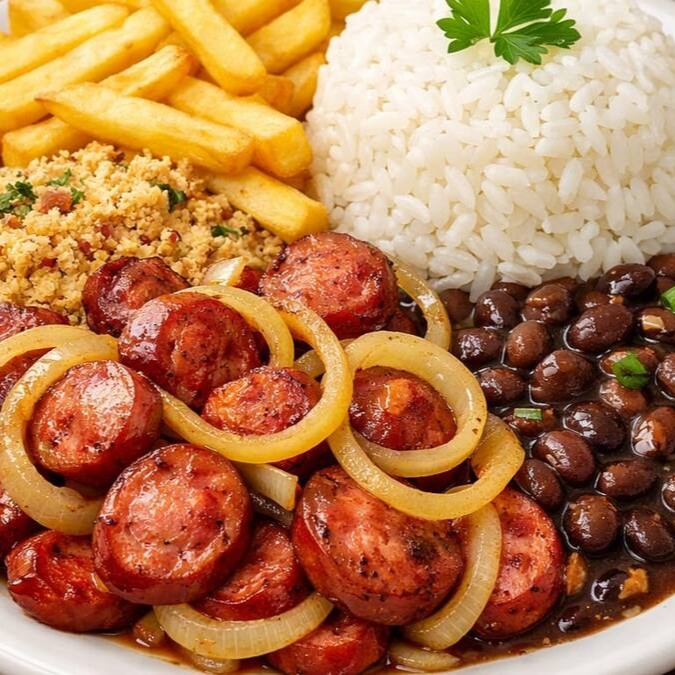 Linguiça calabresa acebolada com fritas, arroz, feijão e farofa