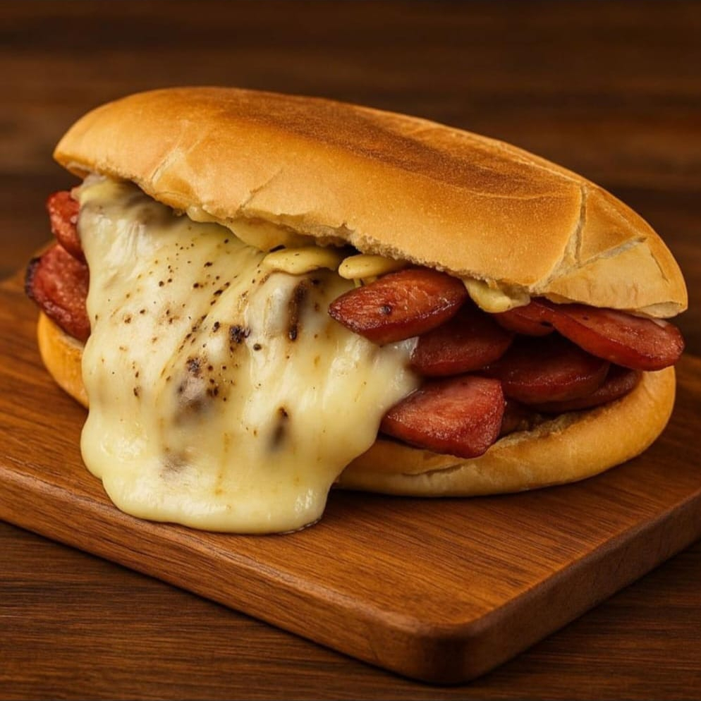Pão de Sal, nossa deliciosa pasta de alho, mussarela derretida e você escolhe a proteína