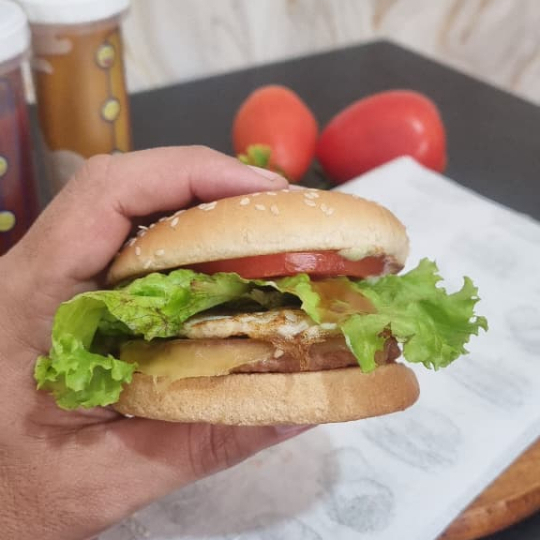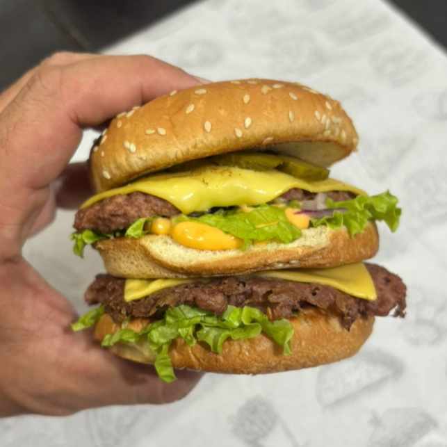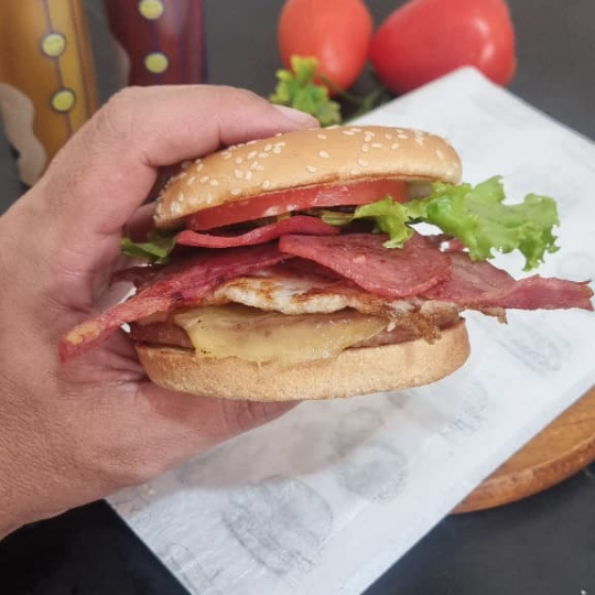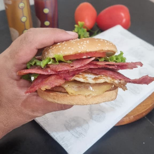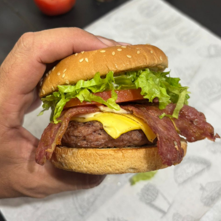 Pão com gergelim, carne artesanal de 120g, queijo, duas fatias de bacon, molho tasty, alface e tomate.