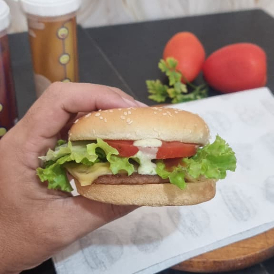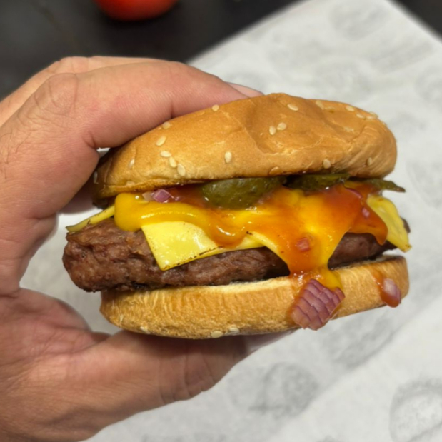 Pão de gergelim, carne artesanal de 120g, queijo, ketchup, mostarda, cebola roxa e picles.