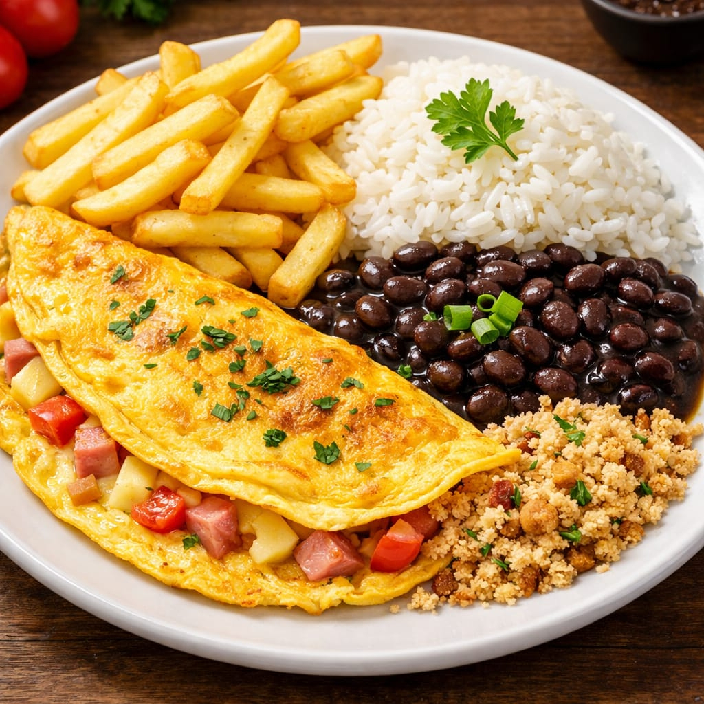 Omelete com batata, cenoura, arroz, feijão e farofa