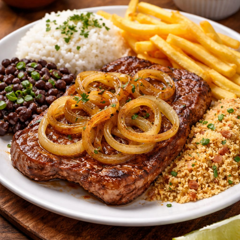 Bife de Alcatra acebolado com Fritas, arroz, feijão e farofa.