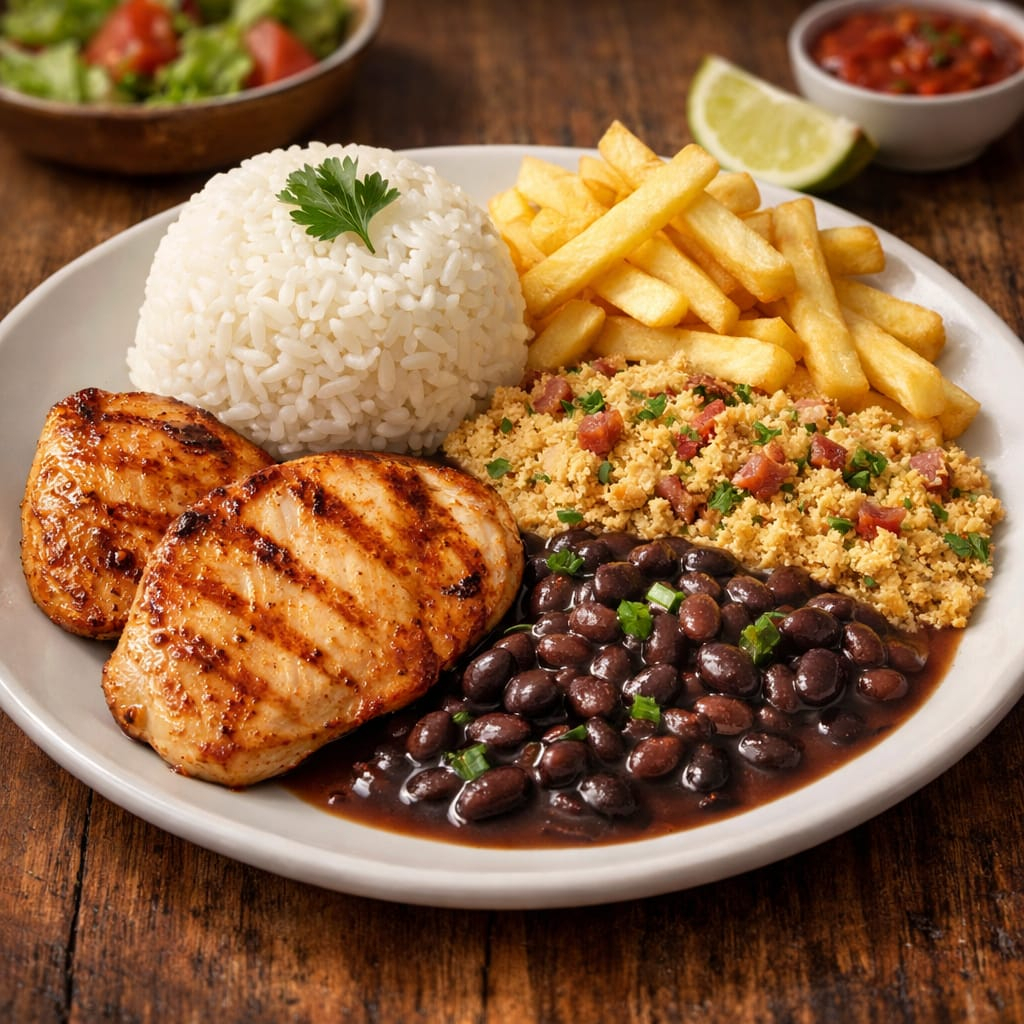 Peito de frango grelhado, batata frita, arroz, feijão e farofa