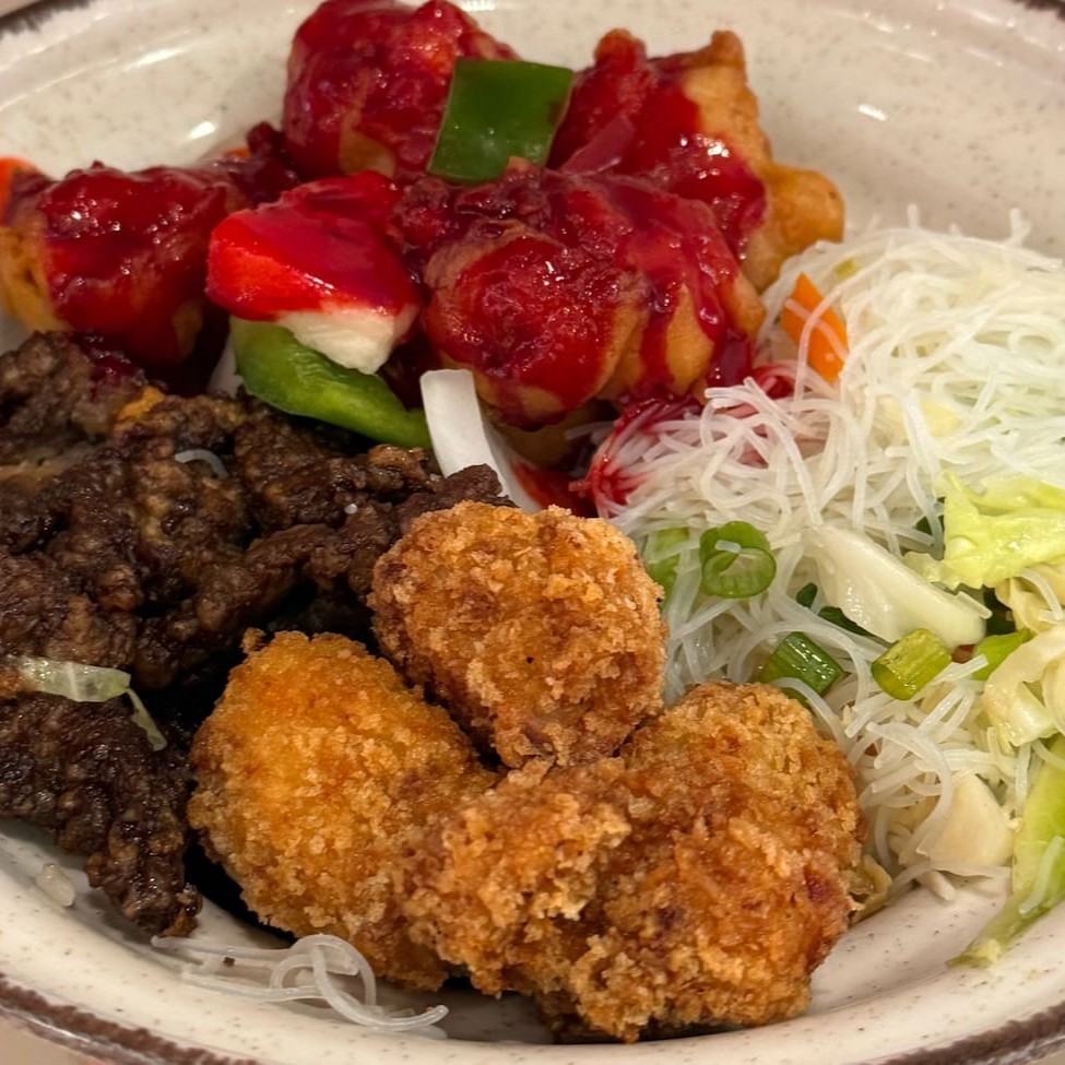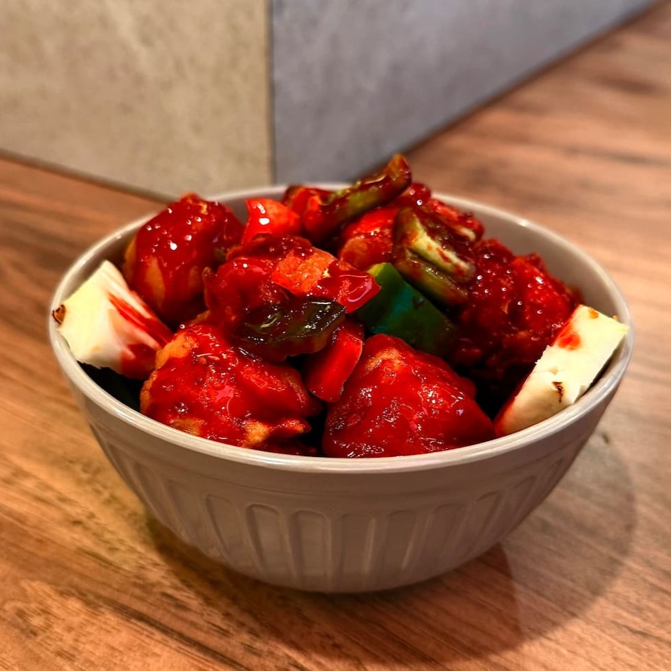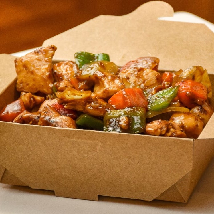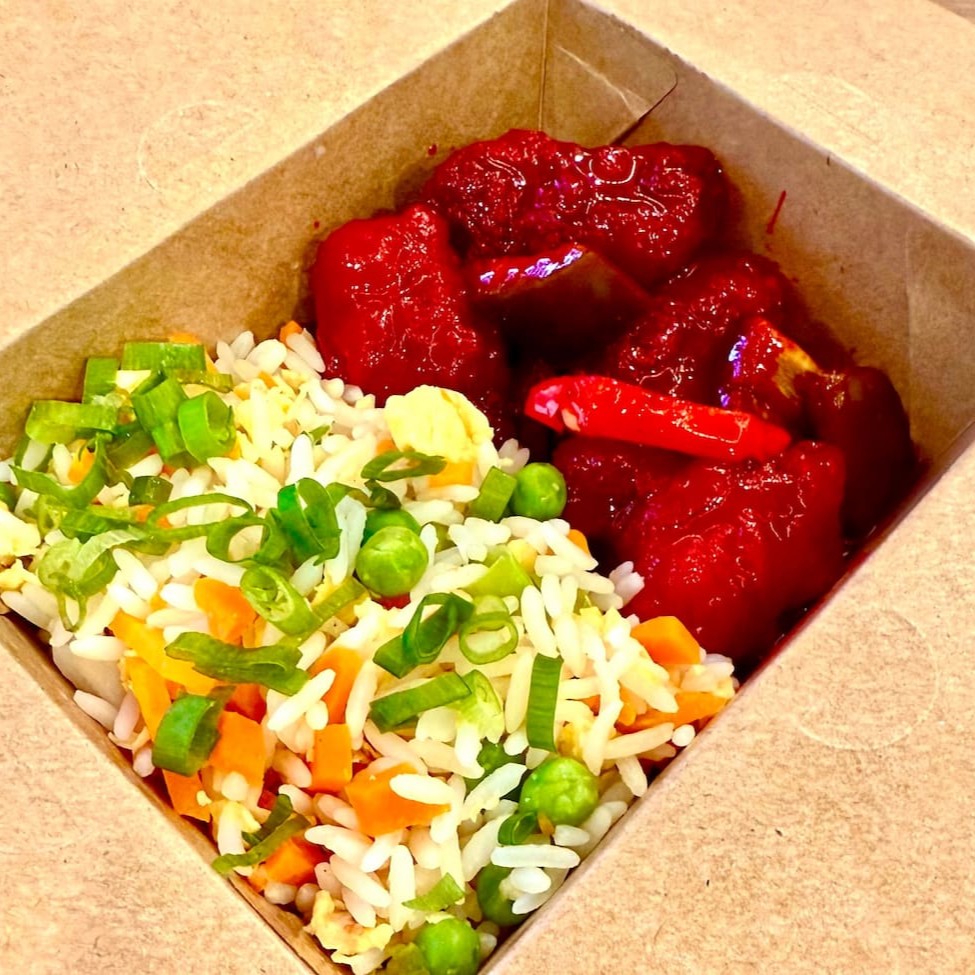 Bolinhas de frango fritas com molho agridoce da casa, legumes e abacaxi