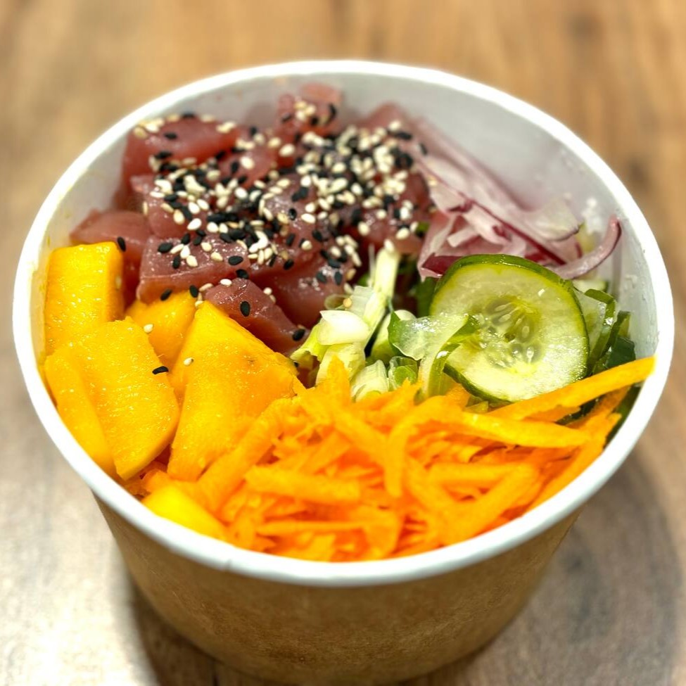 Poke com base Gohan (arroz japonês temperado), atum fresco em cubos, cebolinha, cebola roxa, manga, cenoura, cebolinha, pepino em conserva e gergelim. Servido com molho da casa