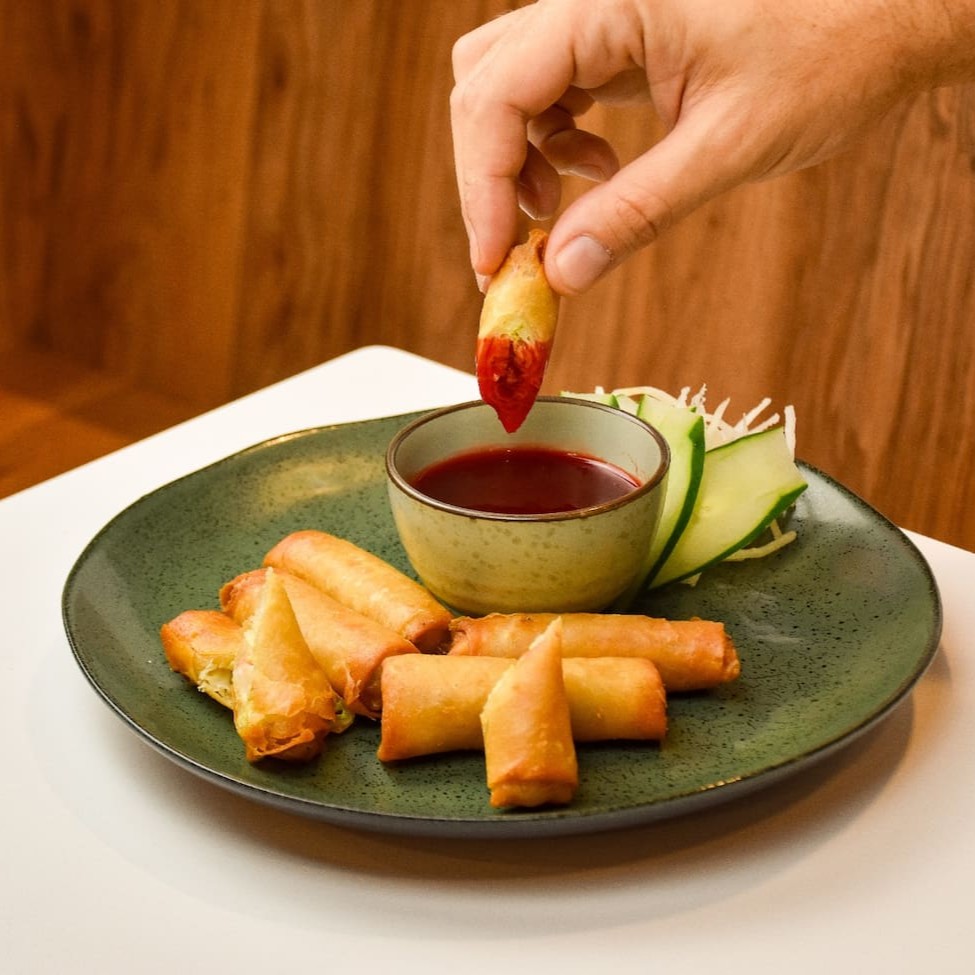 Mini Harumaki crocante de legumes. Servido com molho agridoce.