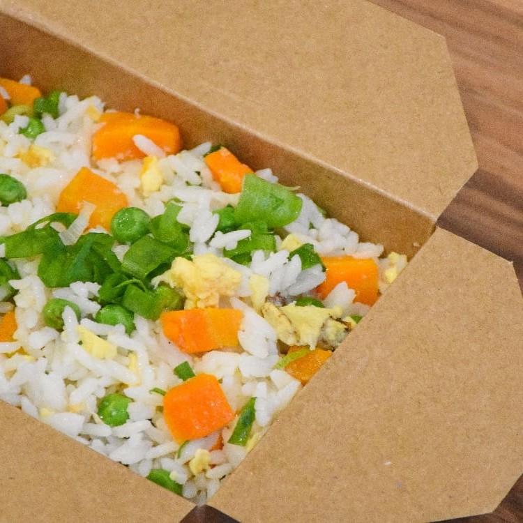Arroz fresco com cenoura, ovo mexido, cebolinha e ervilha.