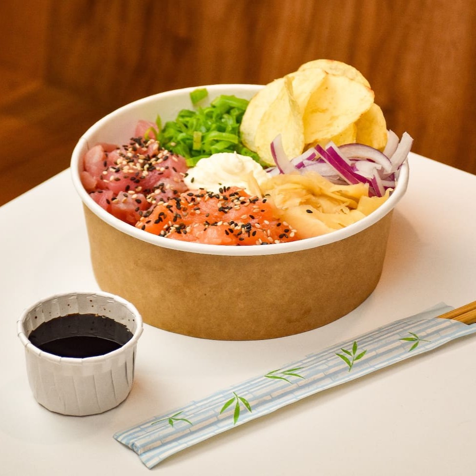 Poke com base Gohan (arroz japonês temperado), salmão e atum frescos em cubos, cebolinha, cebola roxa, gengibre em conserva, couve frita, chips de batata doce e cream cheese. Servido com molho da casa