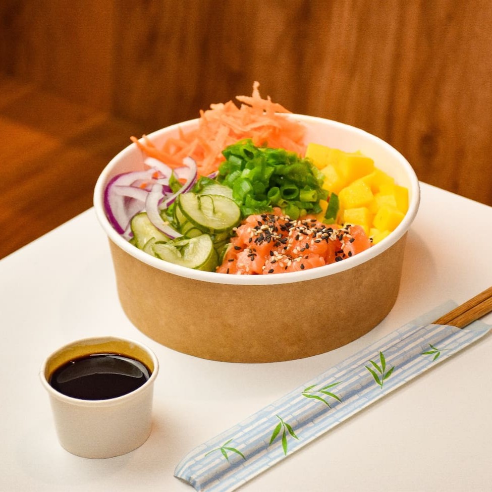 Poke com base Gohan (arroz japonês temperado), salmão fresco em cubos, cebolinha, cebola roxa, manga, cenoura, cebolinha, pepino em conserva e gergelim. Servido com molho da casa