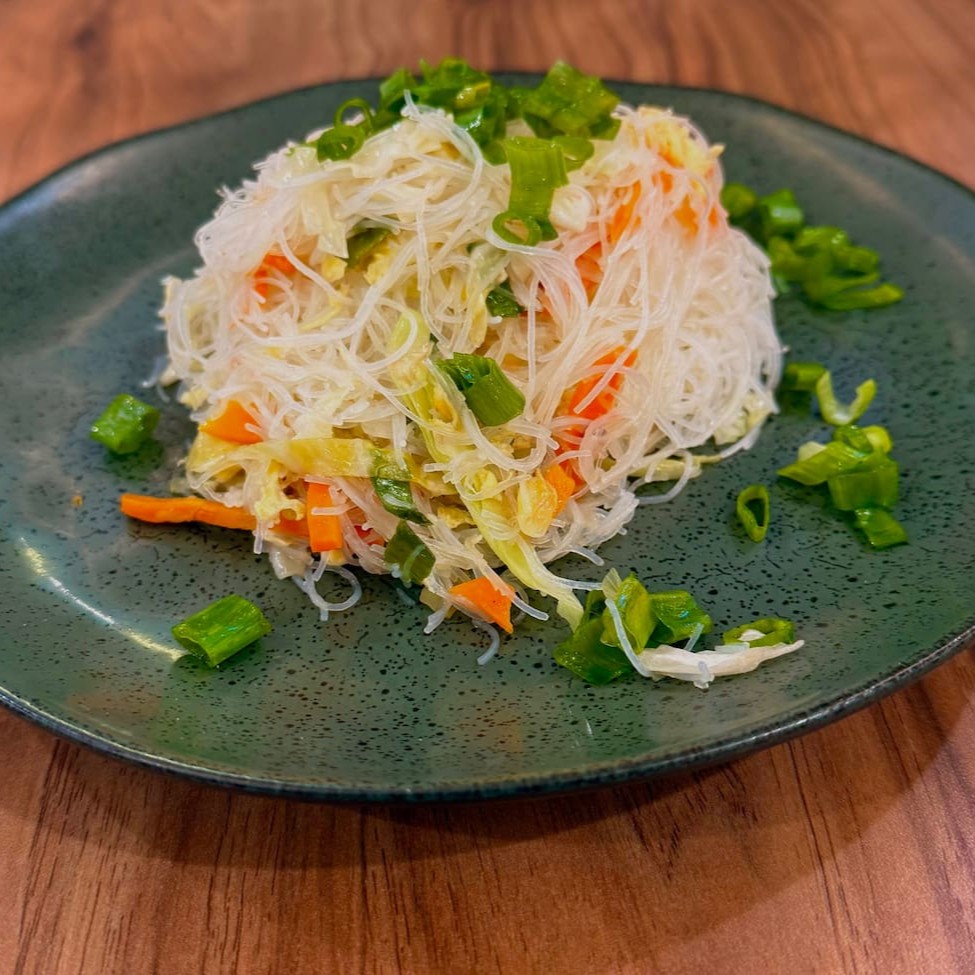 Macarrão Bifum, com ovo mexido, cenoura, cebolinha, repolho e brócolis.