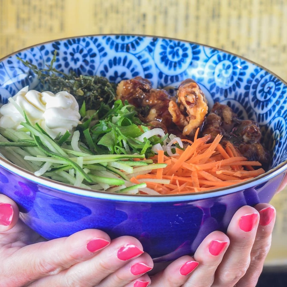 Poke com base Gohan (arroz japonês temperado), bolinhas de frango crocantes com molho teriyaki, cebolinha, pepino em conserva, couve frita, cream cheese e molho teriyaki. Servido com molho da casa