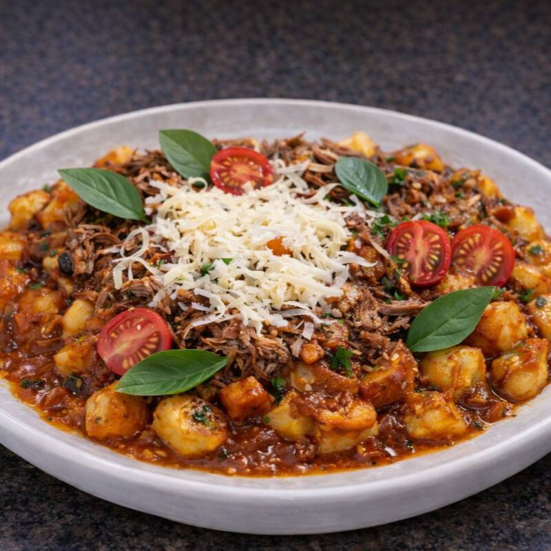 Nhoque de batata-doce com ragu de carne ao molho artesanal de tomates e ervas frescas. INGREDIENTES: Batata-doce, amido de milho, manjericão, carne bovina, cebola, alho, sal, azeite, temperos naturais, molho de tomate artesanal e salsinha.