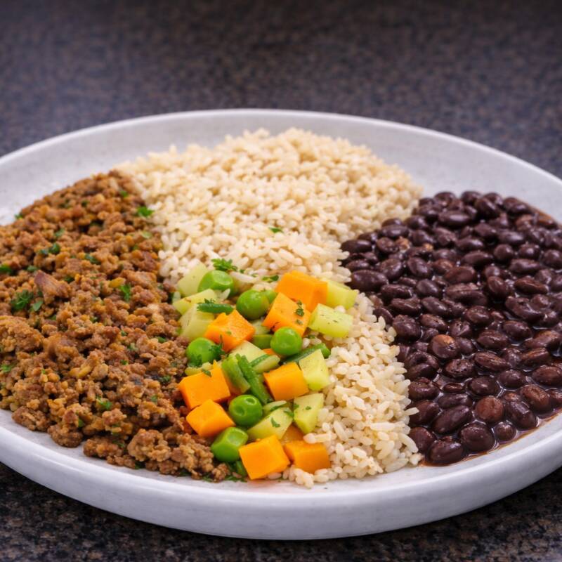 Prato completo e nutritivo com arroz, feijão preto, carne refogada no molho de tomate artesanal, acompanhado de legumes frescos salteados no azeite. Uma versão equilibrada, sem glúten e sem lactose, do clássico carioca. INGREDIENTES: Arroz, Feijão Preto, Carne Moída Bovina, Molho de Tomate Artesanal, Cenoura, Chuchu, Vagem, Ervilha, Alho, Cebola, Temperos Naturais e Azeite.SEM GLÚTEN / SEM LACTOSE