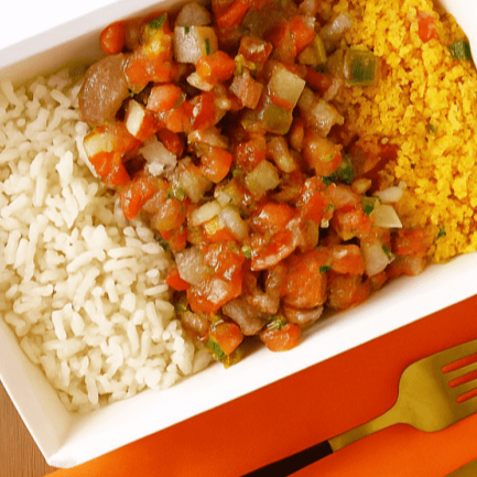 1 embalagem n8G com um delicioso feijão preto , arroz branco soltinho , irresistível macarronese ,molho vinagrete fresquinho e farofa da casa + 1 espetinho de ling de frango .(Serve bem 1 pessoa)