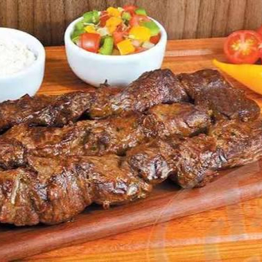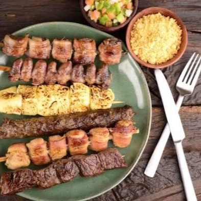 Delicioso churras na brasa composto por 8 espetinhos (2 misto , 2 coracao , 2 carne suina , 2 salsichao e pao ao alho brinde)vinagrete e farofa grátis .