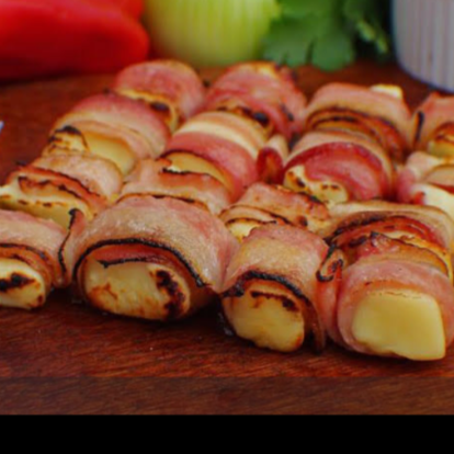 Delicioso espetinho agridoce composto por bacon , goiabada e queijo coalho.
