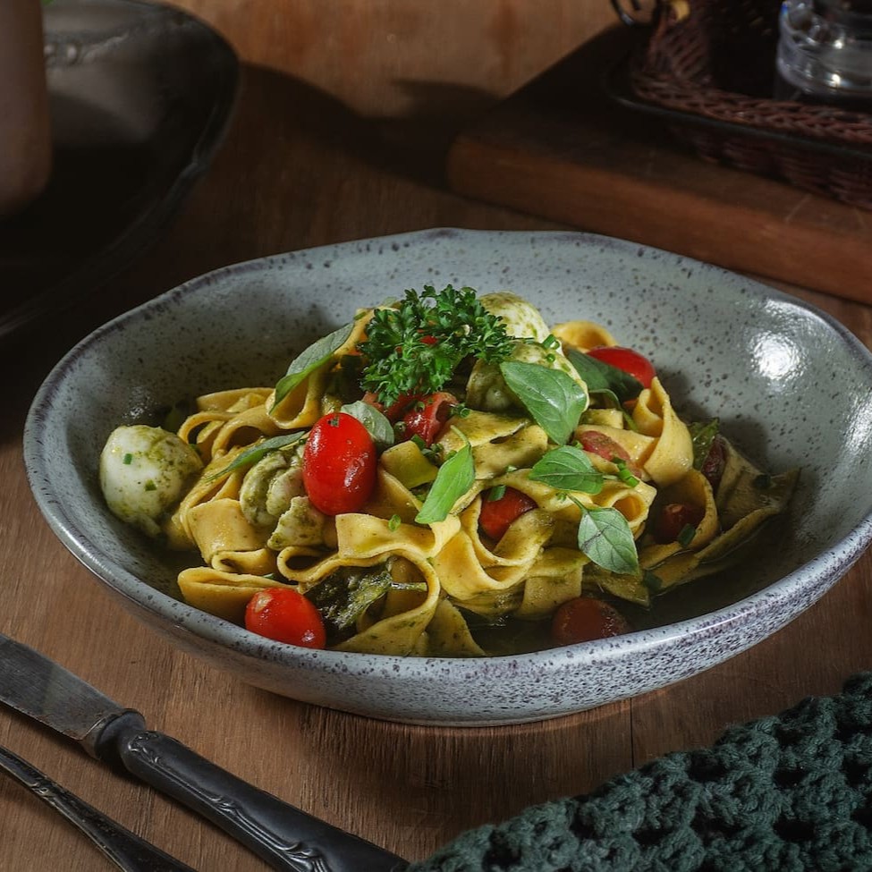 Esta massa delicada é envolvida em um molho pesto aromático, feito com manjericão fresco, pinhões e azeite de oliva, criando uma explosão de frescor e sabor em cada garfada. Para um toque extra de cremosidade, adicionamos pedaços de mussarela de búfala, que derretem suavemente e enriquecem o prato. Tomates cereja suculentos e levemente assados trazem uma nota de doçura e um contraste vibrante ao prato.