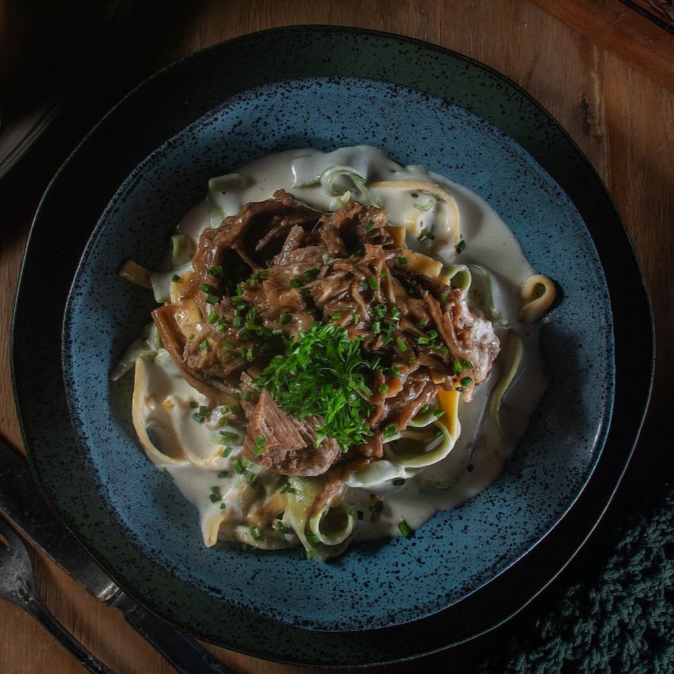 Imagine uma massa talharim artesanal e perfeitamente cozido, mergulhado em um molho branco cremoso e repleto de sabor. Acompanhado por uma deliciosa costela desfiada e bem temperada. Nosso macarrão é perfeito para seu almoço ou jantar. É a massa que traz personalidade.