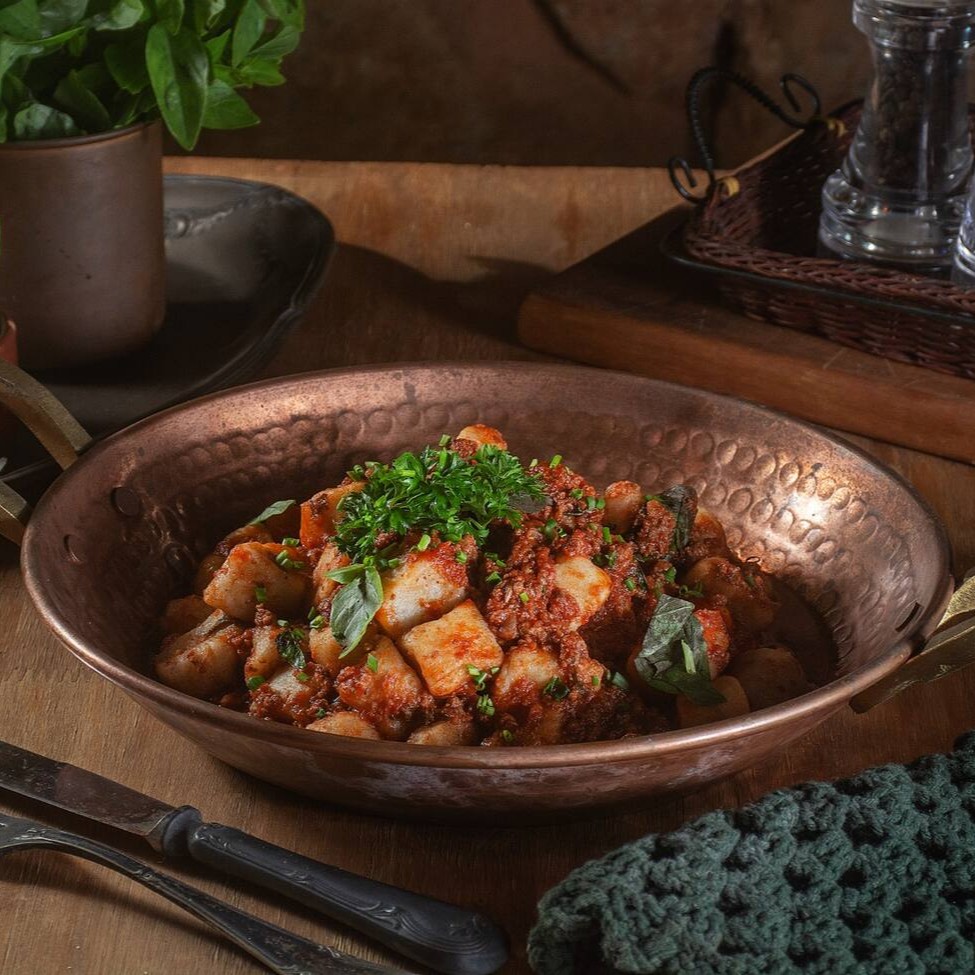 Massa artesanal de batata servida com molho de tomate e carne moída de alcatra. Um clássico simples e saboroso. Acompanha Entrada e Sobremesa Grátis!!!