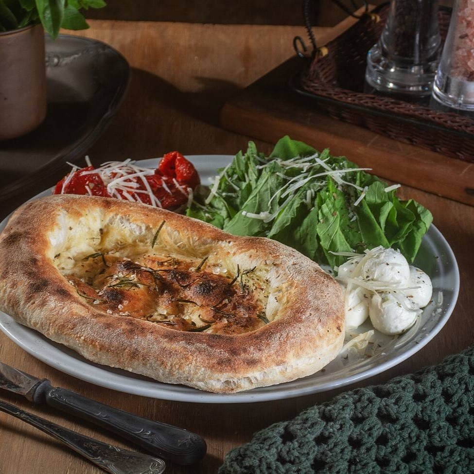 Uma verdadeira obra-prima da culinária! Massa artesanal, macia e crocante. Preparada com alecrim, azeite e sal grosso. Acompanhado com tomate seco cortadinhos, rúculas e mussarela de búfala. Para montar do jeito que você quiser. Ideal para um jantar ou um lanche delicioso, nossa focaccia transforma qualquer refeição em um momento especial.