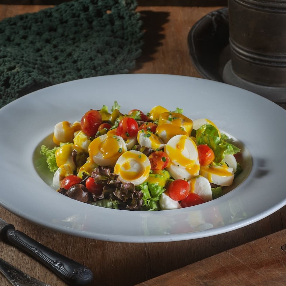 Conheça nossa salada Mediterrânea! Uma combinação de mix de folhas frescas, tomates cereja suculentos e a deliciosa mussarela de búfala. Acrescentamos azeitonas e palmitos delicados para um toque irresistível. Perfeita para quem busca um prato saudável e delicioso!