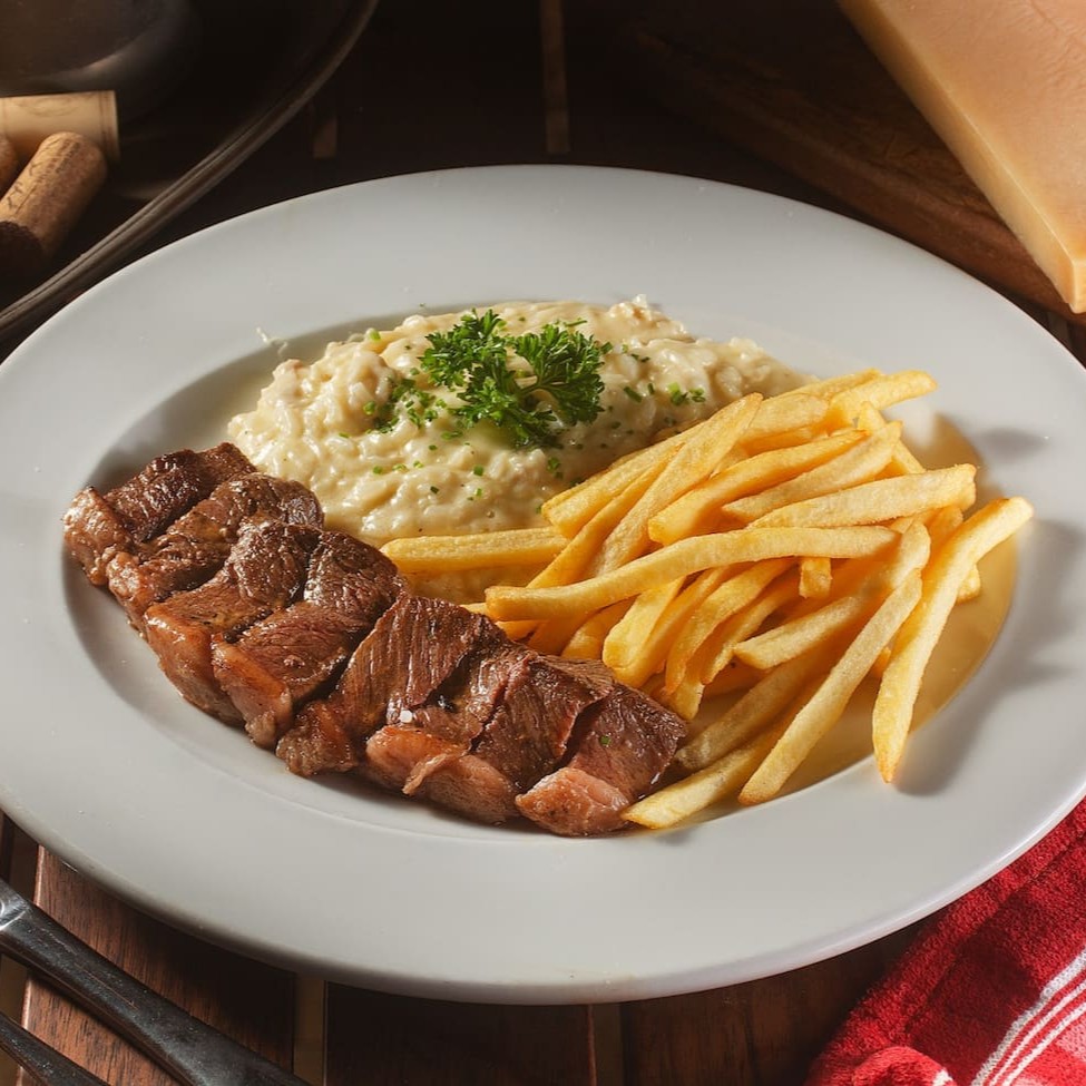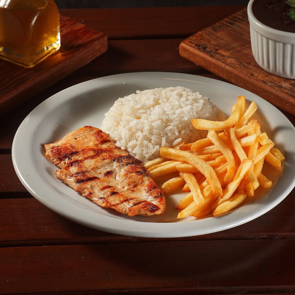 Filé de frango grelhado no estilo brasileiro, acompanhado de batatas fritas crocantes, arroz soltinho e feijão fresquinho. Uma refeição completa, saborosa e equilibrada para o seu almoço executivo.