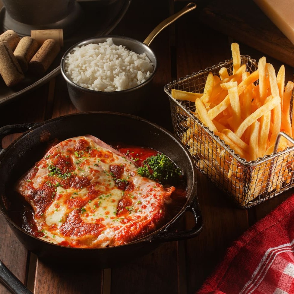 Filé de carne empanado, coberto com molho de tomate caseiro e queijo gratinado, servido com batatas fritas crocantes e arroz branco soltinho.