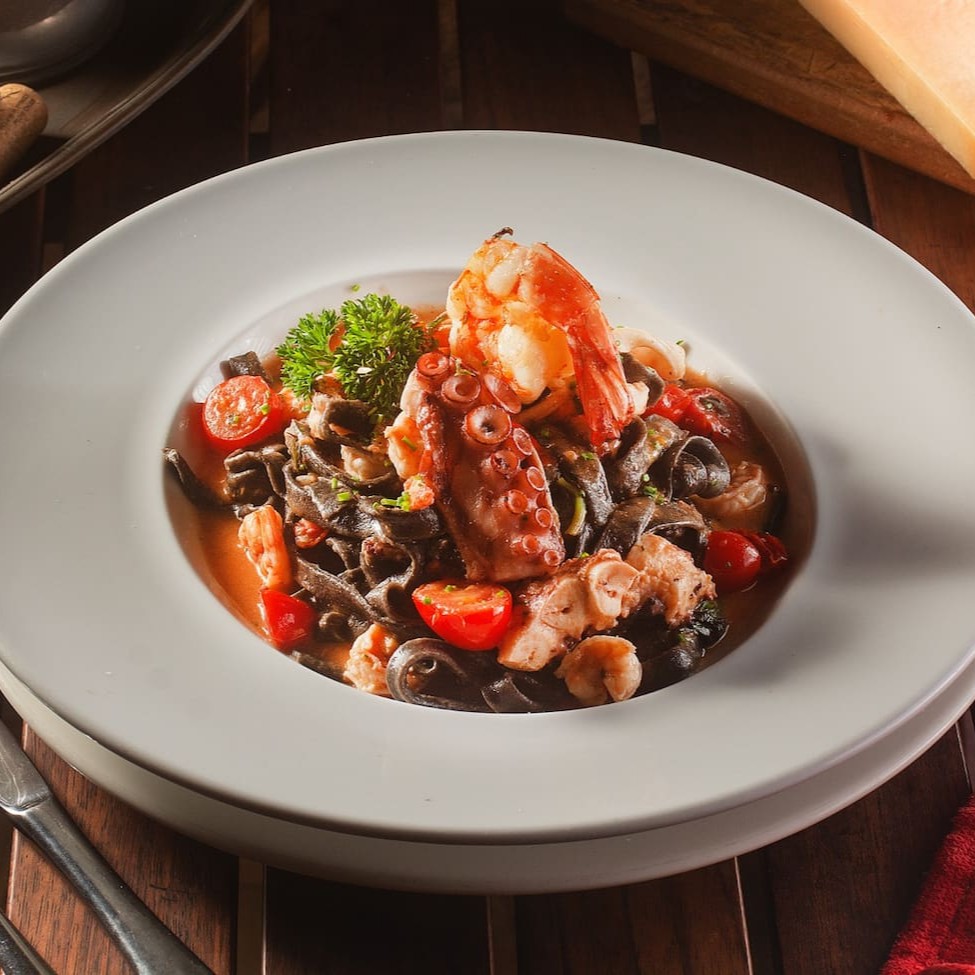Uma explosão de sabores do mar em cada fio de talharim. Nossa pasta negra de tinta de lula é habilmente entrelaçada com uma seleção de frutos do mar frescos, resultando em uma experiência culinária rica e envolvente. Sobre a gente: -Nossos pratos são artesanais - Produtos frescos e feitos na nossa cozinha -Atendimento Rápido -Entrega Segura - Localizado na Barra da Tijuca