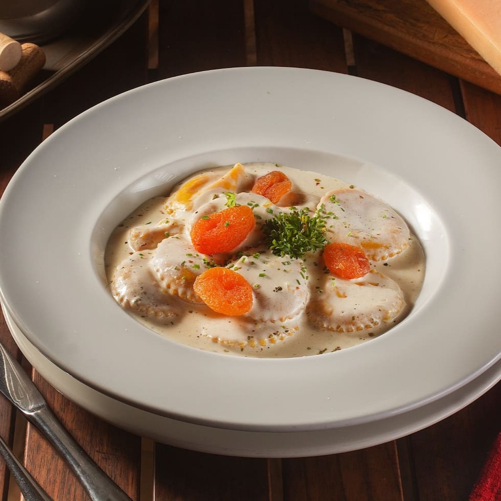 Ravioli artesanal recheado com queijo brie cremoso e pedaços delicados de damasco, servido com molho leve e finalizado com ervas frescas. #Ravioli #Raviolidequijobrie #Queijobrie #damasco #Queijobriecomdamasco #ervasfrescas