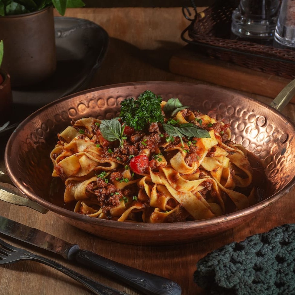 Massa tipo fettuccine artesanal, servida com molho à bolonhesa tradicional, feito com carne moída, tomates frescos e temperos selecionados. Finalizado com ervas aromáticas, é uma refeição farta e saborosa para compartilhar a dois. #Fettuccine #Massa #abolonhesa #pratoparacompartilhar #carnemoida #molhodetomate