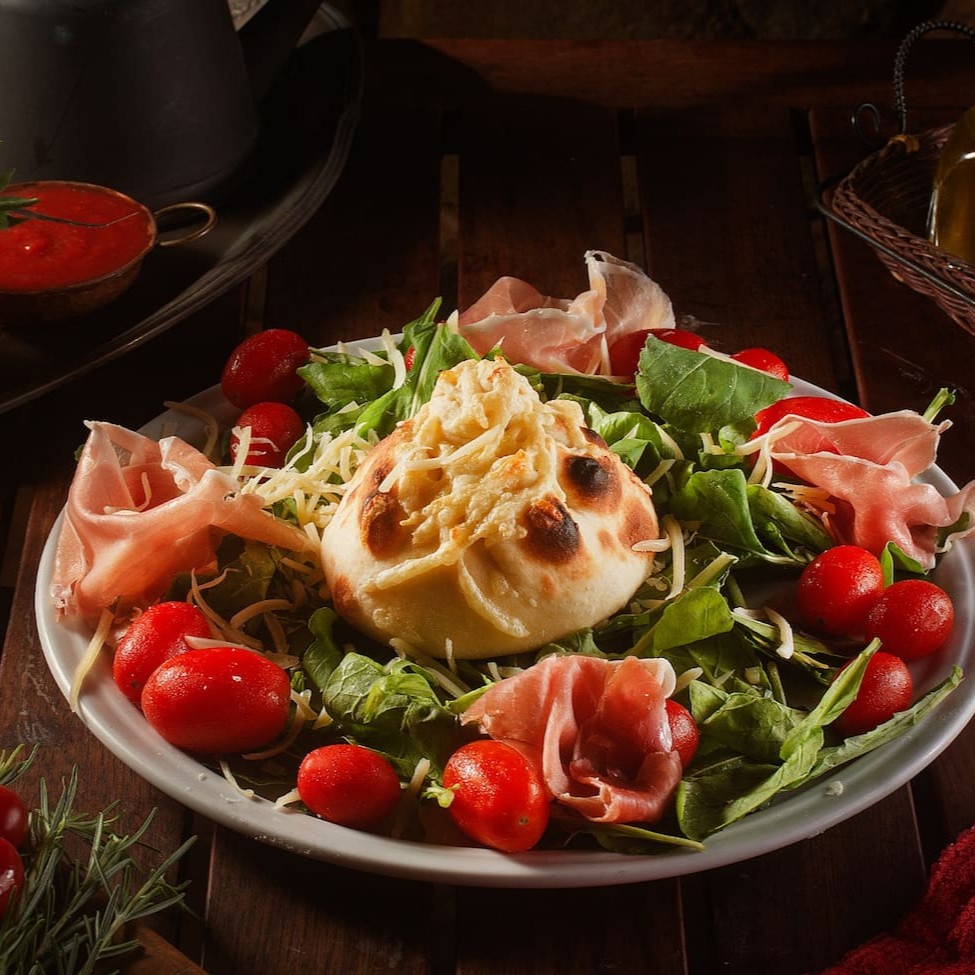 Burrata cremosa sobre crosta crocante, adornada com presunto Parma, rúcula e tomates cereja. Uma explosão de sabores frescos em cada pedaço.