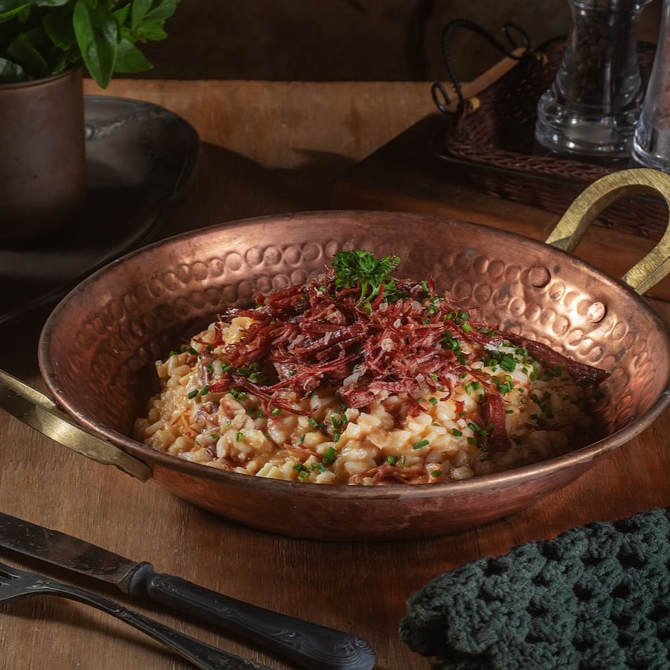 Feito com arroz arbório de alta qualidade, cada grão é cozido lentamente até alcançar a textura ideal, absorvendo todo o sabor da carne seca desfiada e da abóbora caramelizada. A carne seca, desfiada e temperada com especiarias, se une à suavidade da abóbora, criando um equilíbrio perfeito entre o salgado e o adocicado. Finalizado com queijo parmesão e um toque de salsinha fresca, esse risoto é a escolha ideal para quem busca uma refeição saborosa e aconchegante. Perfeito para um jantar especial ou para aquele Dia em que você quer um prato cheio de conforto e sabor. Não perca a chance de saborear essa delícia!