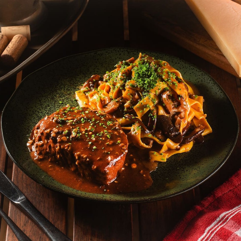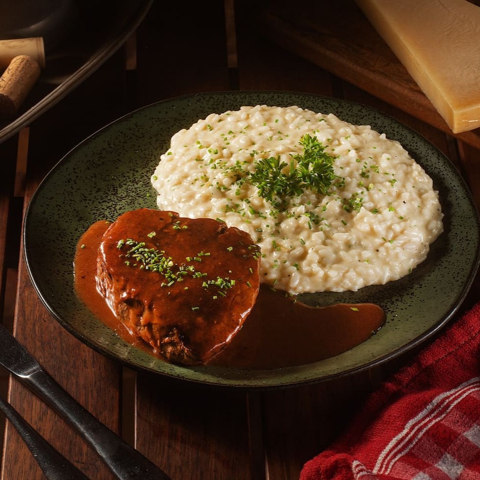 Uma sublime dança de sabores refinados. O risotto, preparado com arroz arborio e enriquecido com o distinto Grana Padano, é coroado com um medalhão de mignon de 200g ao molho Roti. Criando uma experiência que combina indulgência e tradição em cada colherada.