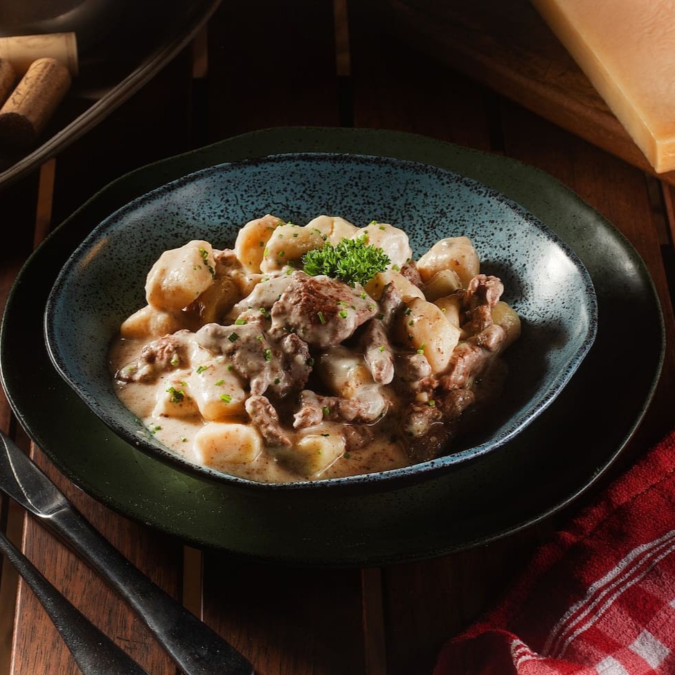 Um refinado deleite culinário. Gnocchi delicadamente envolvido em lascas de carne, regado com um molho de 4 queijos e gratinado para a perfeição. Uma experiência de luxo em cada mordida.