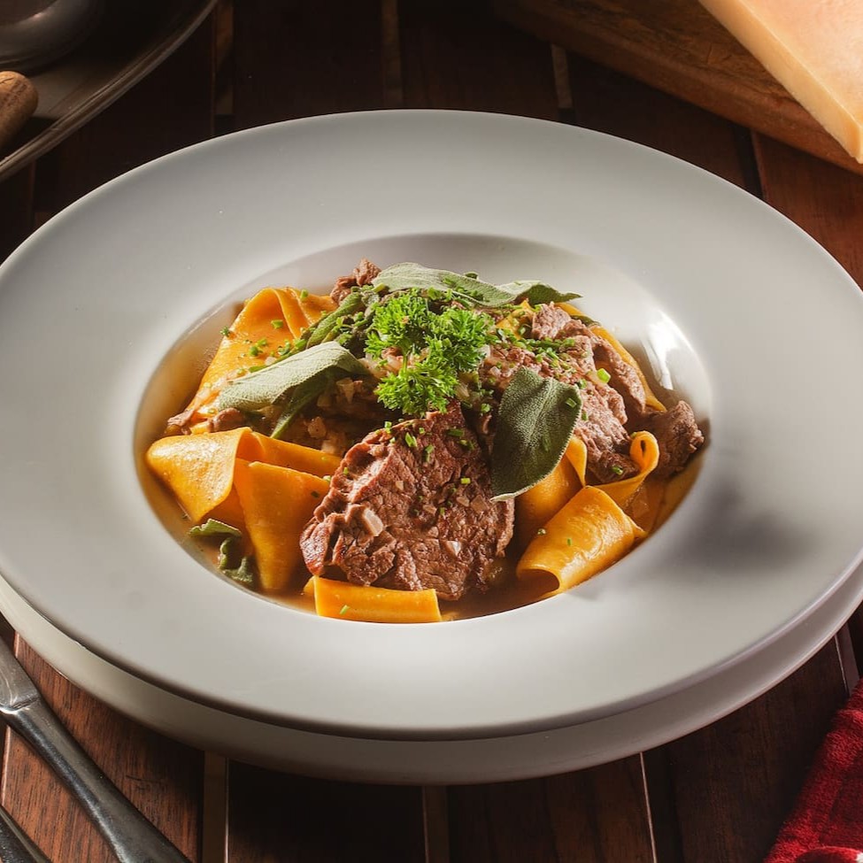 Nossa versão apresenta camadas generosas de carne de costela desfiada preparada com cebola, alho e tempero, cozida lentamente até a perfeição, entre folhas de massa delicada e molho de tomate pellatti.