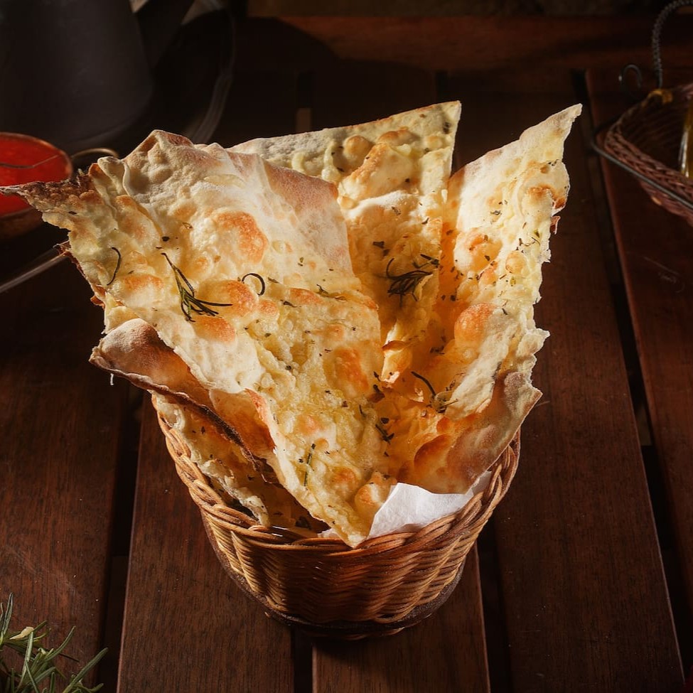Massa fina e crocante, molho branco cremoso, seleção de queijos premium, alho fresco e ervas selecionadas. Uma ótima entrada com azeite.