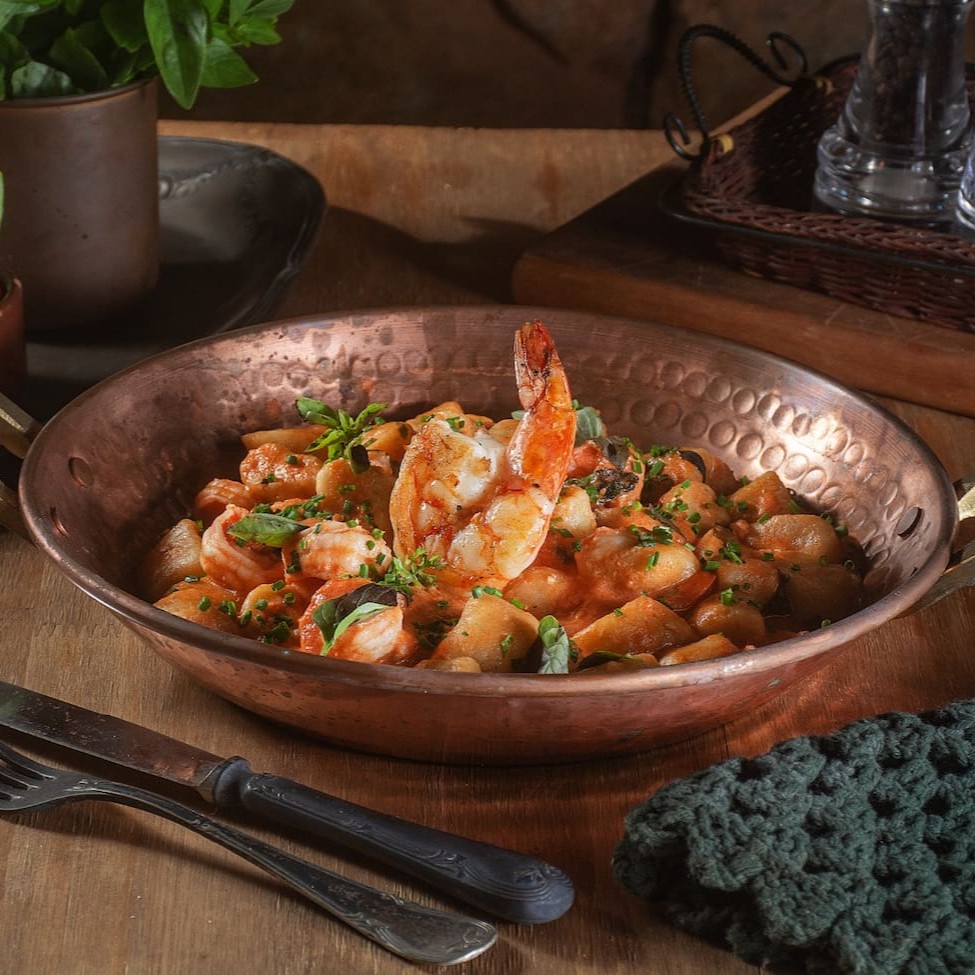 Preparado com gnocchi macio e caseiro, este prato combina suculentos camarões salteados, envoltos em um molho rosé cremoso que traz um equilíbrio perfeito entre o sabor do tomate e a suavidade do creme. O toque especial vem do gratinado, que adiciona uma crosta dourada e crocante à superfície, fazendo com que cada garfada seja uma experiência única e irresistível. Finalizado com um toque de ervas frescas e queijo derretido, este prato é ideal para os amantes de frutos do mar que buscam um momento de conforto e sofisticação. Perfeito para um jantar romântico ou uma refeição especial em família, o nosso Gnocchi de Camarão ao Molho Rosé Gratinado promete encantar seu paladar e transformar qualquer ocasião em um momento inesquecível!