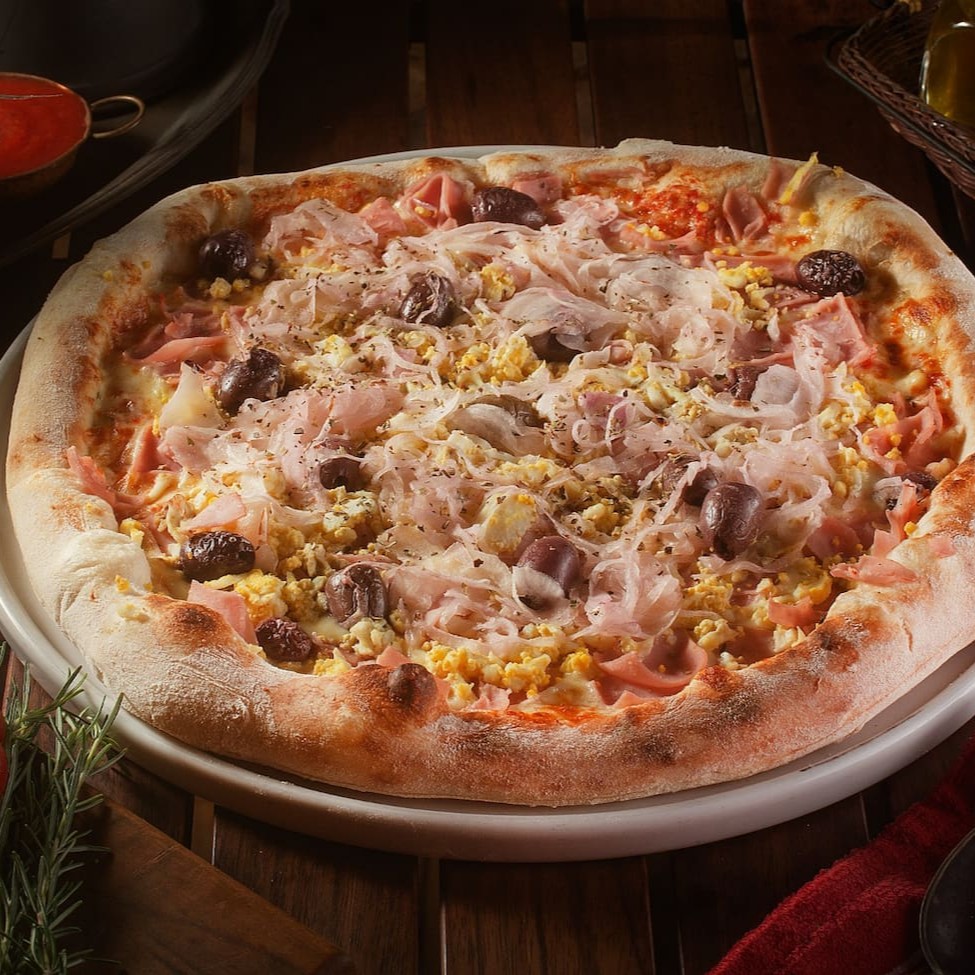 Pizza grande de 35cm, preparada com massa leve e borda crocante, assada em forno à lenha para um sabor autêntico e defumado. Escolha seu sabor preferido e aproveite uma experiência artesanal do início ao fim.