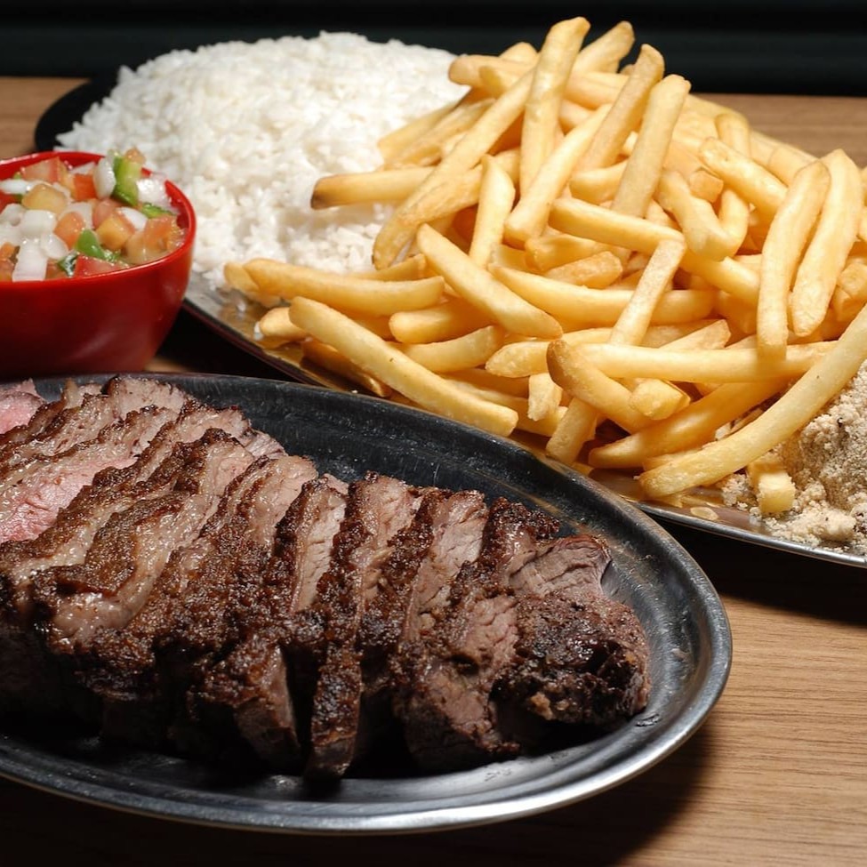 Delicioso bife de contra filé acompanhado de arroz, feijão, fritas e 1 ovo. Adicione mais itens se desejar.
