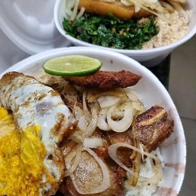 Delicioso carré frito acompanhado de arroz, feijão, couve refogada, 1 ovo frito e farofa da casa.