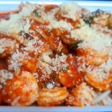 Deliciosa massa aldente, ao alho e azeite, regado com o delicioso molho de tomates e camarão da casa. Prato em embalagem Pequena, comportando o volume de 500ml. Serve muito bem uma pessoa.