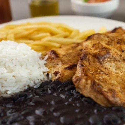 Delicioso filé de frango grelhado com arroz, feijão e batata frita. **Esta opção é para aqueles que comem pouco, pois está em porção de 500ml, não 500gramas*** Imagem Ilustrativa