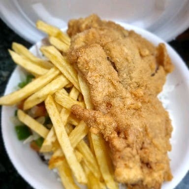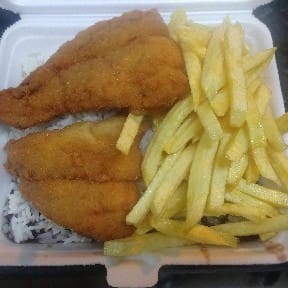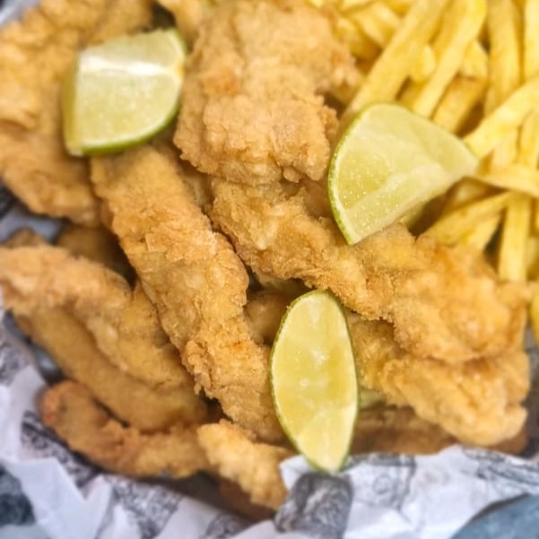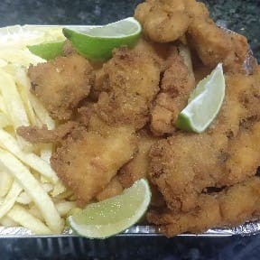 Iscas de peixe (filé de peixe) marinados em especiarias e empanados. Acompanha as deliciosas fritas da casa.