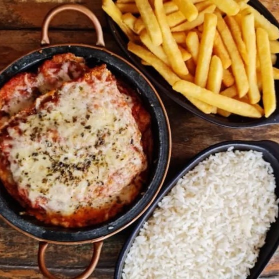 Delicioso bife de contra filé à parmeggiana, Escolha até 4 opções para acompanhar.